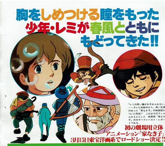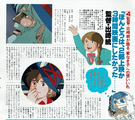 Tetsuo Katayama: この作品は放映当時は聴率はそんなによくはなかったんです。(編集部注・平9%)けど子どもが涙を流しながら見ていたので、親としてほんとうに感激した” といったような手紙をもらうなど、良質の作品としての評価はすごかった。おまけに、オランダ・イタリアなど海外でも放映され、視聴率は40%(オランダ)もあげた。これは「家なき子」という作品がもつ知名度、また立体アニメーションの美しさ、質の高さなどの証明でしょうね。こういう条件が重なり”そんなに評判のいい作品なら、ぜひ映画化を”と今回のはこびになったわけです。それに、じつをいうと、この映画化にもうひとつ意味があるんです。東京ムービーにはアクションアニメ映画のヒット作「ルパン三世」があります。でも、社としては、もうひとつの路線名作アニメ路線をぜひつくりたいと長年思っていました。たとえば、映画「宝島」のようなものをね……。つまり、この路線がいけるかどうかをさぐる、一つの試金石が、この「家なき子」になるわけです。映画の内容は、5本のテレビ用フィルムを、監督の出崎統自らぜんぶ見なおし3度絵コンテを書きなおし、また、シナリオも3度書きなおしました。だから、ぜったいに、テレビの焼きなおしといっ映画にはなっていません。もちろんアフレコも、やりなおしてありますし……自信作です!!ぜひ、見てください!!