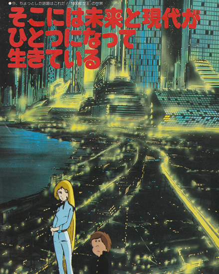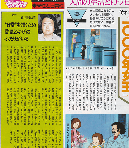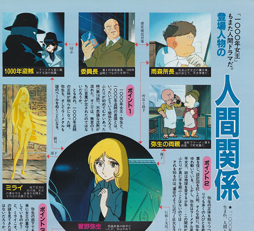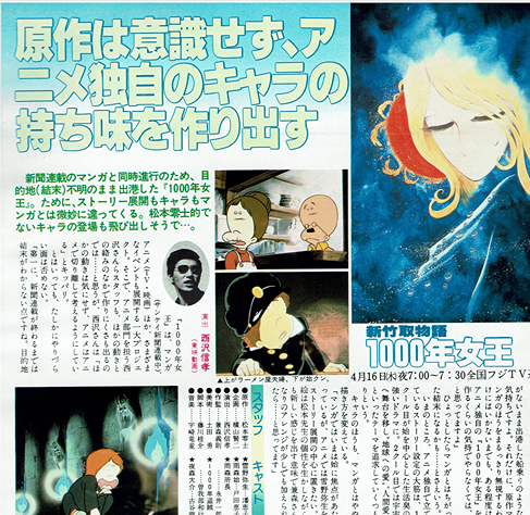- May ’81 [TA]: Q. 銀河鉄道999はわかってスタートする”1000年女王” またまたおもしろそうですね。こ れまでの松本アニメの中ではどん な特徴の作品になるのですか。A. ご存知のように、いわゆる 本アニメには“四畳半もの”と スペースSF”と呼ばれるもの があるわけですね。今回の“1000年女王”には、この2つの要 素をドッキングさせたかたちの作 品なのです。”999”のよう に、スペースの部分だけでなく、 東京の下町のような、生活感がム ンムンしているような場所も舞台 になります。四畳半と宇宙という 正反対と思える世界が奇妙にマッ チして、なかなかおもしろいと思 いますよ。(Youichi Kominato)