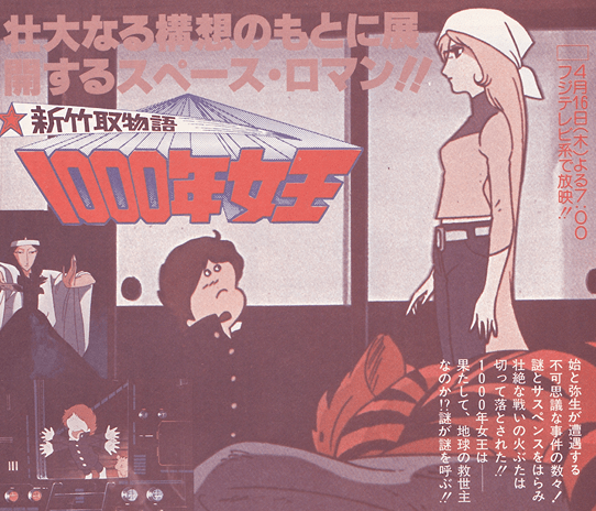 松本零士のSF ロマン 「1000年女王」(サンケイ 新聞)が、アニメ化されることになった! 11月の「松本零士スペシャル」を皮切りに、来年春 のテレビシリーズ化、そのスペシャル版、さらに劇 場用映画と、多角的で遠大な構想のもとにアニメ作 品化が進められる予定。いま、話題を呼ぶ「1000年女王」ブームアップに、注目してみないか!