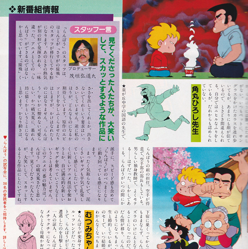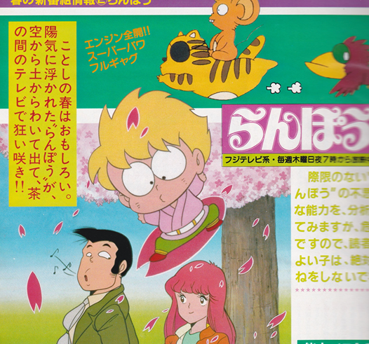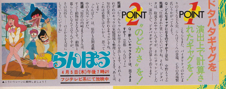 フジテレビ系列で放映されている「らんぼう」と「チックンタックン」の試写会が4月4日、東京の渋谷パンテオンで行われた。オープニングは、「チックンタックン」でミコちゃんのママ役を演じている平野さんがうたう「好きしてチックン」。続いてベル役の千葉繁さんが「ベルのテーマ」を披露して、さかんな拍手をあびていた。いっぽうの「らんぽう」組も、坂本千夏さんが「ワープ・ボーイ」を東郷昌和さんが「気まぐれムーンライト」をうたい、まるで「チックンタックン」と「らんぽう」の”対抗歌合戦”といったところだ。でも、そのあとは仲よく(?)、番組のスタッフが続々と登場。「チックンタックン」「らんぼう」のそれぞれの原作者、石森章太郎先生、内崎まさとし先生も、「番組も応援してください」とあいさつ。チックン役の菅谷牧子さん、チュ太郎役の田中真弓さんもまじえて質問コーナーもあり、田中さんには「同じ時間に、『巨神ゴーグ』にも出てますけど、どっちをみればいいですか?」なんて、イジワルなことを聞く人も。これには、真弓さんもドギマギし、ファンは大爆笑。これ以外にも、イベントの中身は盛りだくさん。「チックンタックン」「らんぼう」のシングル盤、原作者のサインがはいったコミックス、それにセル画が当たる抽選会も開かれ、会場は熱気いっぱい。最後に第一話が上映され、盛況裡にイベントは終了した。