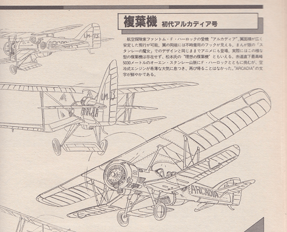 ファントム・F・ハーロック: 空の冒険者として世界中の空を飛びつづけてきたファントム・F・ハーロック。ハーロック世界で決してかかすことのできないキャラクターであり、ハーロック世界のベース的役割りをしている。原作(スタンレーの魔女の冒頭)では、年令が若かったハーロックであったが、「わが青春のアルカディア」では初老の男になっている。そのことにより、ハーロックに重みが増し、生き生きとしている。キャラクターシートを見てもらえばわかると思うが、ハーロックというキャラクターは、どうみても*ハーロック”そのものなのである。F・ハーロックの精神は、未知なるものへの探求心であり、征服心である。そして、その精神はハーロックに受け継がれており、未知なる大宇宙の背景をバックに、宇宙船アルカディア号を駆るハーロックにその精神(ロマンといってもよいが)が生きている。