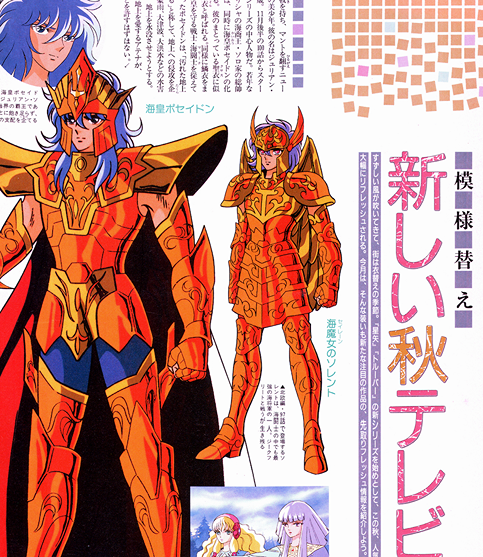 三又の戟を持ち、マントを翻すニューフェイスの美少年。彼の名はジュリアン・ソロ。16歳。11月後半の100話からスタートする新シリーズの中心人物だ。若年ながら、ギリシャの海商王・ソロ家の総帥である彼は、同時に海皇ポセイドンの化身でもある。彼のまとっている聖衣に似た鎧は、鱗衣と呼ばれる。同様に鱗衣をまとって、海皇を守る戦士・海闘士を従えて現代に甦ったポセイドンは、「汚れた地上を粛正する」と称して、地上への侵攻を企む。彼は、豪雨、大津波、大洪水などの水害を起こし、地上を水没させようとする。もちろん、地上を愛するアテナが、そんなことを許すはずはない。地上のアテナVS海界のポセイドン新たなる闘いの火蓋が切って落とされる。その期待の新シリーズの導入と展開を旗野義文プロデューサーに聞いてみた。「北欧編のクライマックスでは、星矢がオーディンローブをまとい、バルムングの剣で、ヒルダにはめられた指輪を切ります。元のヒルダに戻ってハッピーエンドかと思ったとき、突如起こった大津波に沙織がさらわれ、舞台は海界へと移ります」ヒルダを操って氷を溶かし、地上を水没させることに失敗したポセイドンがいよいよ自らのり出す、ということらしい。「ポセイドン編は、原作に沿って話を進めていきますが、北欧編からのつなぎの部分にはオリジナルの話も入ります。星矢たちが挑む強敵・海将軍との闘いが、何と言っても見どころですね」オープニングの絵とアイキャッチが新しくなるという楽しみな新『星矢』。新しい用語もたくさん出てくるから、左のコラムでしっかり予習しておこうネ!