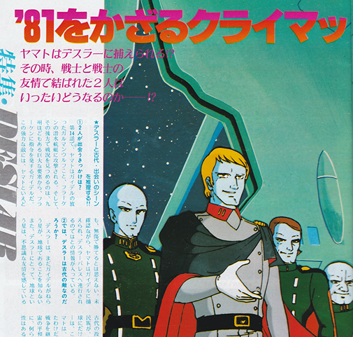 Nishizaki: 4話くらいでその影をあらわし、13~14話くらいで本格的に登場する。デスラーはね、『国家は滅びるとも民族は滅びず』と、銀河系にちらばっているガルマン民族をたずね歩き、それを基礎に大帝国を築き上げている。