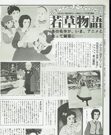 Tomiro Kuriyama: 過去のアニメをふりかえってみると、ドラマの構成に重点をおくよりも、アニメでしかできない題材に重点をおいた作品が多かったわけです。しかし、いまはアニメもありとあらゆるジャンルに挑戦するようになってきたんですね。その一つが、このような名作もの路線です。名作ものは、実写で数多く映画化されたり、舞台などで上演されたりして、幅ひろい人々に鑑賞されていますし、ストーリーもよく知られているので、アニメ化する場合、構成をどう一味変えるかで苦労するんです。今回の「若草物語」にしても、100年まえにオルコットによって書かれてベストセラーになって以来、いまもって世界中で大量に読まれている作品ですよね。したがって、この原作のもつ魅力、つまり、読者を引きつけるものを、どうやってアニメなりのやり方で引きだしていくかが、作品の勝負どころなんです。そこで、私としては、つぎの二つの点に作品の味をもとめて、なんとかアニメ的手法の中で描きたいと思っています。まず一つは、それぞれに個性的な魅力をもった4人姉妹の女らしい心理のあやを表現すること。さらには、南北戦争期の健康なアメリカンデモクラシーのふんいきをだすことです。時代の高揚期のなかで、4人の姉妹がどんなふうに生きていくか・・・一家そろって感動できる作品にしたいですね。