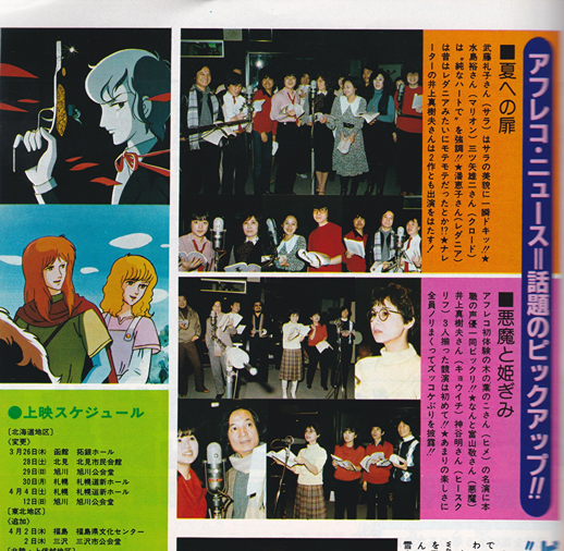 斬新な映像と豪華多彩なスタッフ 声優陣で今、話題集中の「夏への扉」 (竹宮恵子 原作)。音楽の方も、2 月3日、コロムビアのスタジオでレ コーディングが完了しました。 作曲の羽田健太郎氏自らが、コロ ムビア・シンフォニック・オーケス トラと共に演奏に参加。原作の持つ 繊細さや華麗さを見事に表現した素 晴しい楽曲が仕上がりました。 メイン・テーマ「夏への扉」の他 「燃える夏」「レダと白鳥」「哀愁のマ リオン」などタイトルを聞いただけ でもゾクゾクするようなものばかり 全11曲が録音されました。伊集加代 子さんのスキャットが入った「愛の テーマ~サラ・ヴィーダ」などは、 スタッフも余りの素晴しさに思わず 息をのんだとか。アルバムは3月25 日、コロムビアから発売予定です。