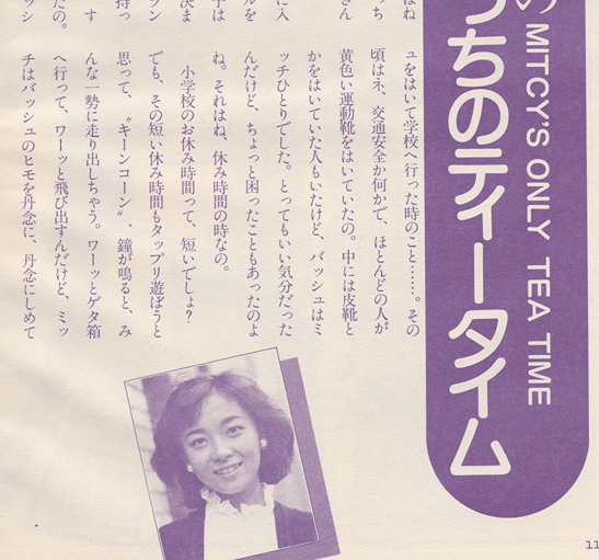 1: 私立鶴見女子高校。 2: 学生時代からお仕事をしていましたので、 勉強とお仕事の両 四苦八苦!! お友だちに、助けてもらってばかりいました。 3: 得意な科目は、えへへ、ご想像におまかせします。 苦手な科 目は、数学でした。 4: 小・中・高、どの卒業式でも、泣いてばかり。 涙があふれて 止まらなくなるんです。 泣き虫なんですね。 でも、ほんとうに “サヨナラ”って言葉に弱いんです…。 5: 小さい頃はバイオリニスト。 あこがれてました。 6: ウフフ…… かなわなかったけれど、 今はとっても幸せ! この道に進んで、とってもよかったと思ってます。 7: “明日はきっと何かいい事がある” そんな前向きで、 何事に もくよくよせず ハッピーな気分で新しい生活を迎えてほしい なあ・・・。 だって、みんな若いんですもの。 わたしもがんばるか ら、あなたもがんばってね!
