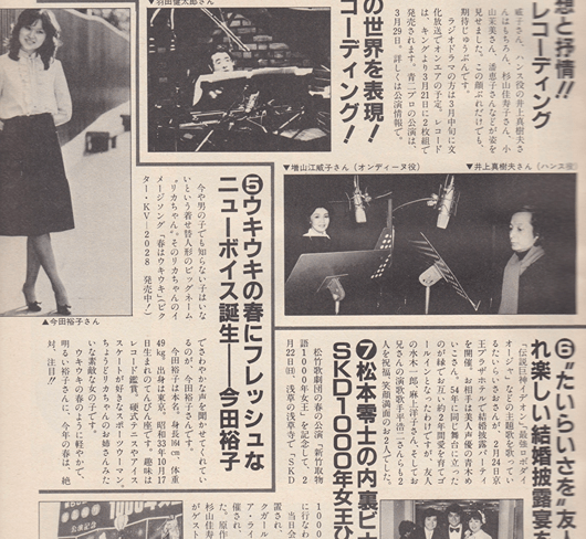 アニメリア・ファンタジカと銘打 たれた青二プロ恒例のシンフォニッ ク・ドラマ「星のオンディーヌ」。 二プロの本公演を前に、ラジオ・ド ラマ用の録音と、アルバム用のレコ ーディングが終了しました。 2月5日、キングのスタジオは、 全8曲の挿入歌を吹き込むため、青 二プロの声優さん達が次々と登場し、 大賑わい。 オンディーヌ役の増山江 威子さん、ハンス役の井上真樹夫さ んはもちろん、杉山佳寿子さん、小 山茉美さん、潘恵子さんなどが姿を 見せました。この顔ぶれだけでも、 期待じゅうぶんです。 ラジオドラマの方は3月中旬に文 化放送でオンエアの予定。レコード は、キングより3月21日に2枚組で 発売されます。青二プロの公演は、 3月29日。詳しくは公演情報で。