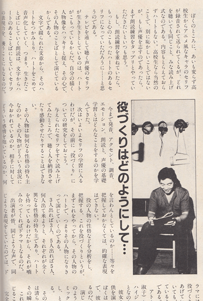 今まで発音、アクセント、調音、 エモーション、朗読と、声優の基礎 学習とはどんなことをするのかを学 んできた。 次はいよいよセリフの学習に入る わけだが、その前に〝役づくり”に ついての研究をしておこう。 与えられたセリフをすぐ読み上げ てみたところで、聴く人を納得させ たり感動させたりすることはできな い。 その人物は如何なる性格の持ち主 なのか、その人物がどういう状況に 今おかれているのか、相手に対して いう感情を抱いているのか、何 を言わんとしているのか……等々を 把握しておかなくては、的確な表現 はできない。 役の人物の性格などを分析をし、 把握する これを役づくりというが、 まずこれをやってから、その人物の ハートで、つまりその人物になりき って演じていくのである。 3人出れば3人、5人出れば5人、 何人出て来ようと、それぞれが全く 異なる性格の持ち主であり、ハート を持っているわけだから、それが噛 み合ってくればドラマとなるのだ。 出演者が皆、同じような声で、同 じょうな表現をしていたのでは、ド ラマにはなってこない。一人一人が、 役づくりをして、生きた人間に創り あげているからこそ、アニメを見て いても、キャラがそのまましゃべっ ているような錯覚を与えてくれるの である。 アトム(清水マリ)も、レオ(太田 淑子)も、鬼太郎 (野沢雅子)も、 ハイジ(杉山佳寿子)も、すべてお となの女性の声である。 彼女らが、なぜあんなに上手に子 供を演じることができるのか ぼくはスタジオで、いつも驚異の目 で、彼女らの演じている姿を見つめ るのだ。 演じている彼女らは、まるで子供 のように、いやそれ以上に、ダイナ ミックに、いきいきとからだを動か し、とびはね、身をよじり演じている。 その表情は童子のようであり、目 は清らかに澄んでいる。彼女らは、 その瞬間、子供になっているのだ。 これが、彼女らが巧みに子供を演 じることのできる秘密なのである。 完全に、役づくりができている。