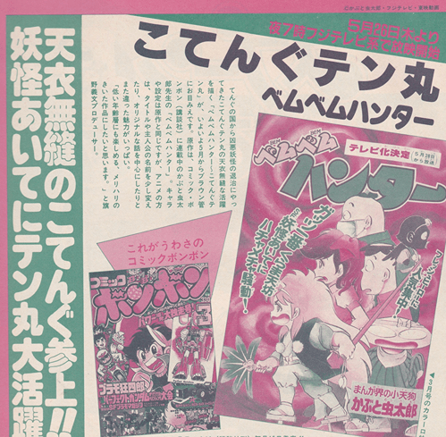てんぐの国から凶悪妖怪の退治にやってきたこてんぐテン丸の天衣無縫な活躍を描く「ベムベムハンター〜こてんぐテン丸」が、いよいよ5月からブラウン管にお目みえです。