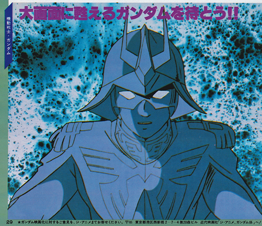 先月号で発表した大まかなストーリーは、ほぼ当っているとの未確認情報が入った。ただし、ディティールが前後することもあるというウワサも流れているが、これも未確認。ともあれ、決定された事だけをお伝えしよう。①音楽は、すべて録音しなおす。②アフレコを当然録り直す。音楽は、録り直しによりさらに深みのあるものになるはずだ。「交響詩ガンダム」のように、より音楽的に完成されたBGMとなるだろう。アフレコに関しては、キャスティングが多小変更されるものと思われる。ひとり二役が、テレビでは多かったからだ。今後も、ジ・アニメではガンダム映画化に関する情報を毎月載せる予定である。ストーリーや構成も、完全に決定されしだい、少しでも早く誌上公開する予定!とりあえず、2月号の情報をおたのしみに-! ガンダムはなぜ?