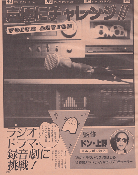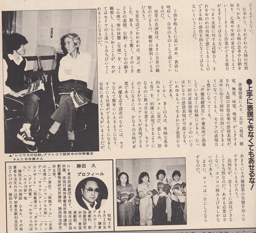 アトムもレオも鬼太郎も、マルコ 徹郎も、すべておとなの女性が演 じている。それも、かなりいい年の ご婦人ばかりである。(はっきりいう と、君たちのママくらいなオバさん たちなのだ!)。 彼女たちは、なぜあんなに上手に 子供を演じることができるのだろう 日常、学校や公園や街角で、 子供の生活や行動を観察し、その特 徴をデッサンしているからにほかな らない。 元気よくはね廻っている子供、転 んで泣いている子供、怒ってけんか している子供、いじけている子供・・・ ・・・そうした子供たちの日常の姿を観 察し、克明に頭の中にデッサンしてる。 おくからこそ、どんな子供の役をあ たえられても、それを生き生きと創 造し、表現することができるのであ マイクの前に立って演じていると きの彼女らの姿は、目は輝き、躍動 感に満ち、生き生きとしている。体 の内から湧き出るエネルギーにより、 跳びはね、手をふり足をふり、実際 の子供以上に子供らしく、生命力に あふれている。 子供を執ように追い求め、貪欲に 吸収し、自分のものとして演じてい るのだ。 彼等の名演技は、まさに日常の観 察のたまもの、観察の勝利といえる だろう。 日常生活でわれわれは、喜ぶ、悲 しむ、怒る、そして驚く。そのとき どきの表情、行動、そして心の動き (心理)、体の状態(生理)を、よく 観察し、とらえておくことが、やが てはセリフの上達へとみちびいてく れることになるのだ。