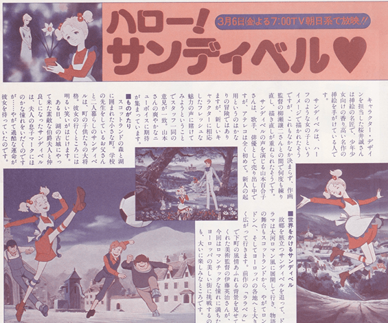 「魔法少女ララベル」の後を受けるファンシー路線の新シリーズとして「ハロー! サンディベル」が登場します。物語の面白さもさることながら、この作品の第一の特徴は、“サンディベル”というハツラツとした新鮮なキャラクターを生み出したことにあるでしょう。これまでの少女漫画の殻を打ち破った全く新しい、魅力あふれるキャラクター──それが今回の製作スタッフの最大の狙いだったのですが、キャラ設定から声優決定までかなり難行したもようで、検討に検討を重ねた末、ようやく誕生したのが、このユニークな女の子、サンディベルなのです。男の子顔まけのウーマンパワーみたいな元気のよさが彼女の売りもので、既成の少女キャラのワクを一歩も二歩も飛び越えた、自由奔放なバイタリティーにあふれています。といっても、女の子らしい優しさもあり、ときにはセンチな気分にひたっちゃうこともあるのですが……。そんなサンディベルが、持ち前の快活さとチャメッ気で、身にふりかかるつらい状況や悲しみを乗り越えて行きます。