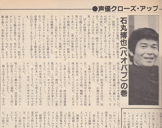 待ち合わせの場所、新宿の喫茶店 に、時間ジャストに行くと、スポー ツマンのようにガッシリとした体格 の彼が、先きにきて待っていた。骨 太の体だ。茶のトレーナーがよく似 合う。その彼が、陽やけした顔をニ とほころばせ、白い歯を見せて、 笑ってぼくを迎えてくれた。 ぼくが時間にうるさい男と心得て の行動ではない。プロとしてごく自 然にふるまっているだけのことのよ うであった。(我々の世界は、きわ めて時間にうるさいのだ。時間にル ーズな人間はやがてスポイルされる。 それにしても、笑顔がかわい いな……全然ちがうことを、ぼくは その時瞬間に思ってみたりした。 …………そうか、これが石丸博也の人 気のヒミツナノカ・・・・・・これが女子高 生に、このコーナーに「石丸サンを 登場させて~~!」と手紙を書かせ たのだな……そんなことを感じさせる。 ウームなるほど。このスポー ツマンのような逞ましさは、同性と しても魅力を感ずる。男のニオイを プンプンさせている。女の子たちが 騒ぐのもムリはない。今が、まさに 働き盛り、青年期から壮年期に入る 最も男らしさを感じさせる頃あいだ。 だが、実年齢を聞いて驚いた。予 想より少々オジチャマであった。そ れにしても若い。 石丸博也、昭和16年2月12日、仙 台は青葉城の近く、広瀬川の清流の ほとりで生れた。 5歳のとき千葉に移り、そして東 京へ。東京の目黒四中から東京高校 へ、そして大学受験。機械いじりの 好きな彼は、エンジニアを目ざして 理工系をねらったのだが、これはみ ごと失敗であった。 失敗したおかげで、彼は役者修業 に入ることになった。浪人中に目に 入ったのが、劇団「ひまわり」の募 集広告。これが彼の人生を変えてし まったのだ。おふくろさんは泣いた そうだ。ワルいヤツ……。 我々の世界には、どうもこの手の 人間が多い。 アレも彼もアイツも… ・・・。ほとんどそうだ。ワルいヤツば かり……。実は、かく申すボクもそ うなのだ。 これだと思いこんだら、トコトン 喰らいついて離れない。芝居の世界 に頭を突っこんだら最期、もう何に も見えなくなってしまう。 親も兄弟もありゃしない。先きの ことも金のことも考えず、どっぷり つかって、しゃにむに進む。 気がついてみたら、いつのまにか 役者として身を立て、何とか食える ようになり、妻子を養っていた・・・・・・ なんてもんだ。 彼も我々と同様、あらゆるアルバ イトを経験している。皿あらい、キ ヤバレーボーイ。印刷工、八百やさ んにちりがみ交換、エトセトラ・.:。 30歳のとき、劇団の仲間、紀子さ んと結婚してからもこのアルバイト は続けられた。 「ひまわり」のときは、はたち代の 若者を集めて、鑑賞にたえる作品を とねばりにねばり、東京都児童演劇 コンクールでの最優秀賞にえらばれ たりもした。だが・・・・・・芝居での収入 はかぎりなくゼロに近かった。 結婚のときも、親には十分な収入 があるとウソをついて安心させた。 家具も何にもない六畳一間の貧乏ぐ らしだったが、つらいと思ったこと は、何にもなかった、思い出せない ……と彼はいう。親をダマしたこと だけが辛い思い出として残っている という。 その彼に、やがてチャンスが訪れ た。太陽プロに籍を移してからアテ みち レコの仕事がポッポッ入るようにな った。そんなある日、突然青二プロ の黒田マネージャーから連絡が入っ た。新番組の主役に石丸君を推挙し ておいたというのである。「マジン かぶと ガーZ」の兜甲児だ。だが第一回録 音の結果はボロボロだった。ディレ クターからはクソミソにいわれ、の のしられた。彼はこの役からオロさ れても止むを得ないと覚悟したそう だ。しかし運命は不思議、事実は奇 なりだ。現実はディレクターが交代 され、彼が残った。 それからは好運が続く、「グレー ト・マジンガー」 「グレンダイザー」 での兜甲児「スタージンガー」のジ ャンクーゴ、「宇宙魔人ダイケンゴ ~」のライガー、「プリンプリン」 のウィリーと続き、新たに「ダイオ ジャ」のスケ役も決まっている。 決してハデではないが、着実な歩 みを続けているといえるだろう。 「役者は40歳すぎから本領を発揮す るもんだと思いますよ。売れる売れ ないは時の運、気にしない、気にし ない……。 別れぎわに彼は、また白い歯を見 せ、真黒な顔をほころばせて笑って 見せてくれた。