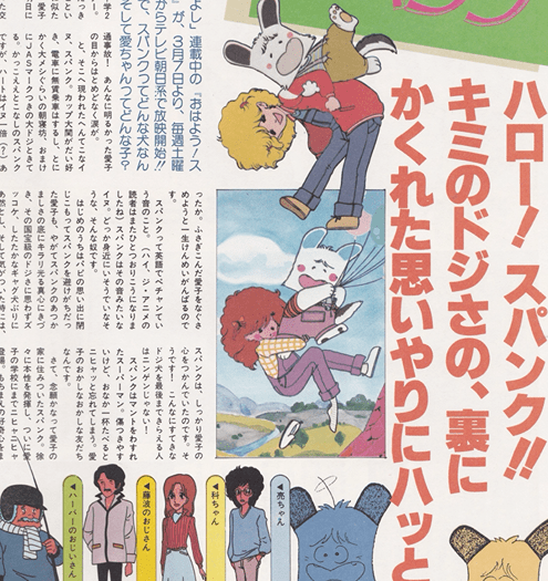 「巨人の星」や「ムーの白鯨」のようなアニメを作ってきたぼくとしては「おはよう! スパンク」はサリーちゃんもの以来の少女マンガ・タッチの作品です。ポーズひとつ、背景の模様ひとつとっても女の子の感覚がぜったい必要なのでスタッフ全員女のコにしてくれと頼んでみたり苦労してますよ。異和感のない楽しくてギャグっぽい画面がだせたらいいですね。画面的に理屈ぬきのおもしろさがあふれてるのはスパンク。スパンクは平面的で、だいたい正面をむいて出てくるんです。それに、座っても立っても同じ二頭身。きちょうめんな作画より動きを第一にしてるからです。とにかく愛子ちゃんもスパンクもかわいさめいっぱいに表現したい。ビビらずのびのび作画して楽しい作品になると思いますよ、きっと。