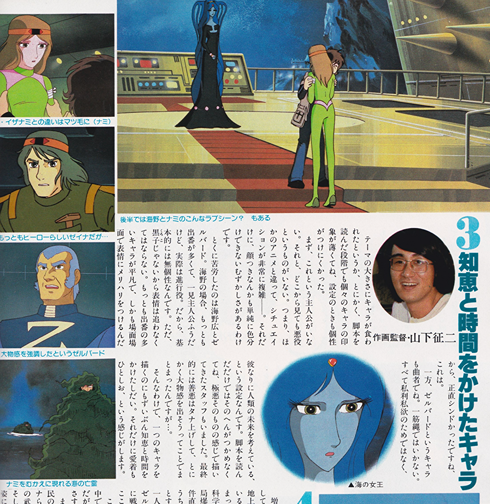 Seiji Yamashita: テーマの大きさにキャラが食われたというか、とにかく、脚本を読んだ段階でも個々のキャラの印象が薄くてね、設定のときも個性がつけにくかった。まず、これという主人公がいない。それと、どこから見ても悪役というものがいない。つまり、ほかのアニメと違って、シチュエイションが非常に複雑。それだけに、顔つきなんかも単純に色分けできないむずかしさがあるわけです。とくに苦労したのは海野広とゼルバード。海野の場合、もっとも出番が多くて、一見主人公ふうだけど、実際は進行役。だから、基本的には無個性なんです。ただ、黒子じゃないから表情は追わなくてはならない。もっとも出番の多いキャラが平凡で、しかも場面場面で表情にメリハリをつけるんだから、正直シンドかったですね、これは。一方、ゼルバードというキャラ曲者でね。一筋縄ではいかない。すべて私利私欲のためではなく、彼なりに人類の未来を考えている、という設定なんです。脚本を読んだだけではそのへんがつかめなくてね、極悪そのものの感じで描いてきたスタッフもいました。最終的には善悪はタナ上げして、とにかく大物感を出そうってことでまとまったんですが・・・。そんなわけで、一つのキャラを描くのにもずいぶん知恵と時間をかけたしだい。それだけに愛着もひとしお、という感じがします。