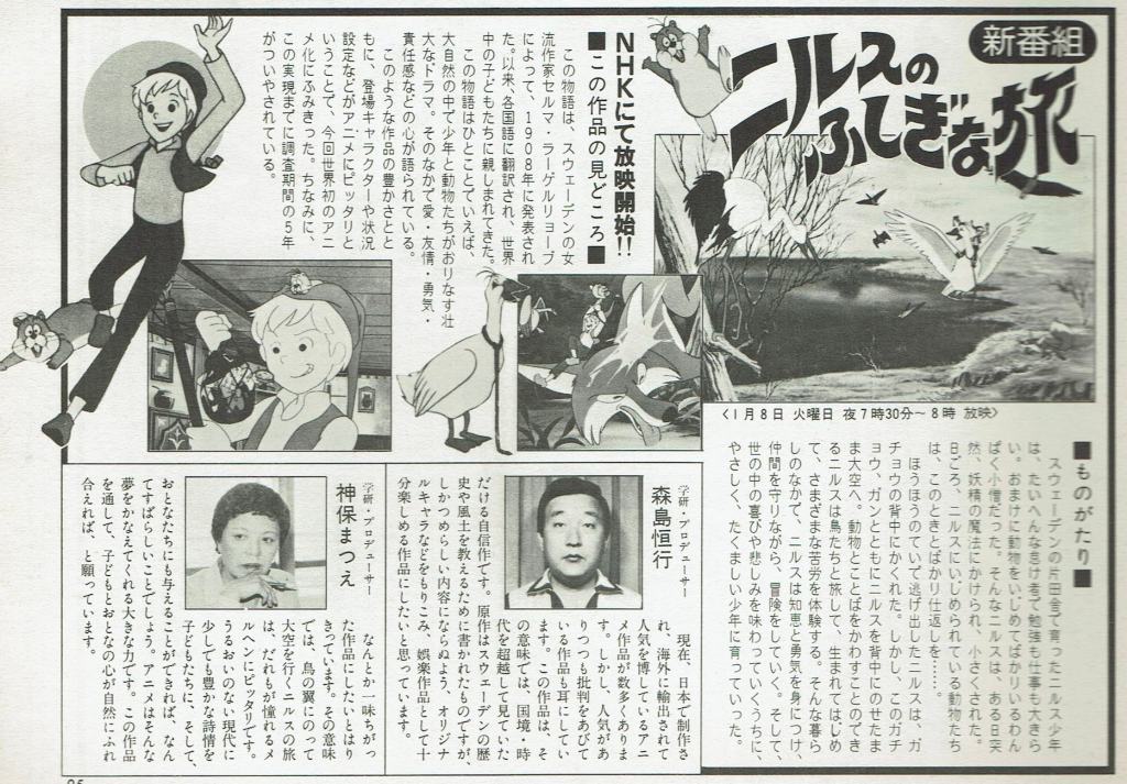 NHKにて放映開始!! この作品の見どころ■ この物語は、スウェーデンの女流作家セルマ・ラーゲルリョーブによって、1908年に発表された。以来、各国語に翻訳され、世界中の子どもたちに親しまれてきた。この物語はひとことでいえば、大自然の中で少年と動物たちがおりなす壮大なドラマ。そのなかで愛・友情・勇気・責任感などの心が語られている。このような作品の豊かさとともに、登場キャラクターや状況設定などがアニメにピッタリということで、今回世界初のアニメ化にふみきった。ちなみに、この実現までに調査期間の5年がついやされている。