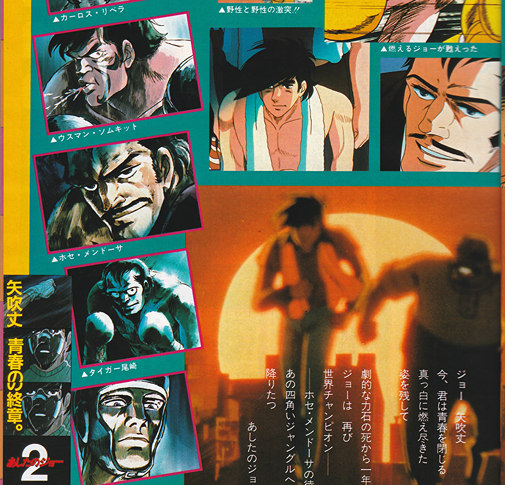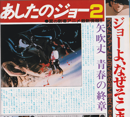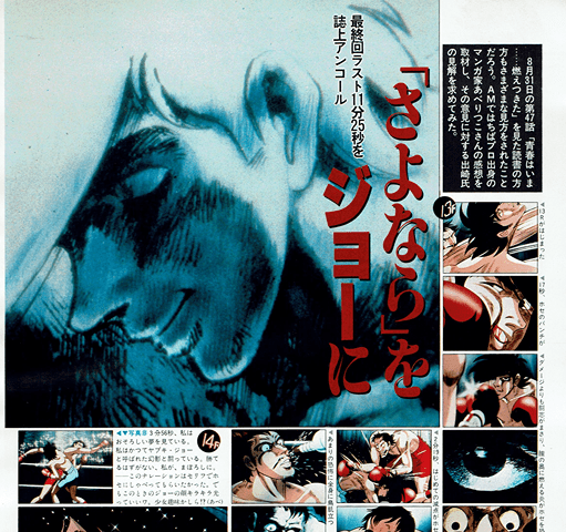 AM. ジョーは生きているのか、死んだの かー右のイラスト(原作の最終ペー ジ)は、当時(昭和48年6月)ファン の間で随分、論議を呼んだ。そして、 前回のテレビの「ジョー」は、途中で 原作に追いついてしまったという事情 もあって”カーロス戦”までしか描い ていない。 はたして、今回は……?!?!