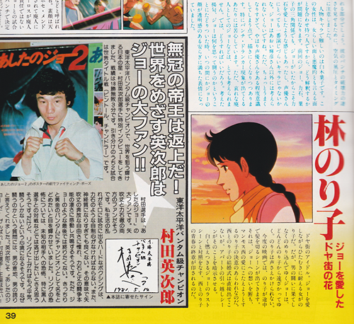 東洋太平洋バンタム級チャンピオンで、世界を狙う輝け る日本の星・村田英次郎選手に特別インタビューをしてき ました。戦績は1勝無敗3分です。引き分けのうち2試合 は世界タイトル戦(ピントール、チャンドラー)です。 村田選手は「あ したのジョー」の 大ファンです。 矢 吹丈と力石徹の両 方のファンだそう です。私生活の乱 れがモロに試合に出るハードなボクシングは、 力石のような自制心がなければならない。また、 神経質になりすぎても良くない。その意味で矢 吹丈の奔放な自由さに憧れ、力石と丈の闘争本 能の凄さに感動し共鳴するそうです。ただ、ジ ヨーのような最後では終りたくない。きっちり と黄金のバンタムにチャンピオンとして名をと どめたいと目を輝かせていました。リングの恐 怖については、未知の相手への恐怖、特に黒人 選手との対戦などでは逃げ出したいとさえ思う そうです。だけど、リングに上がればもう平気、 闘うしかないという心境になるそうです。なぜ 闘うのかという質問には、男の意地、男の誇り と答えてくれました。「英次郎こそあしたのジ ヨーだ」 がんばれ!村田選手・・・王座は近い!