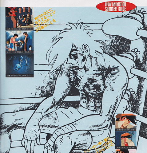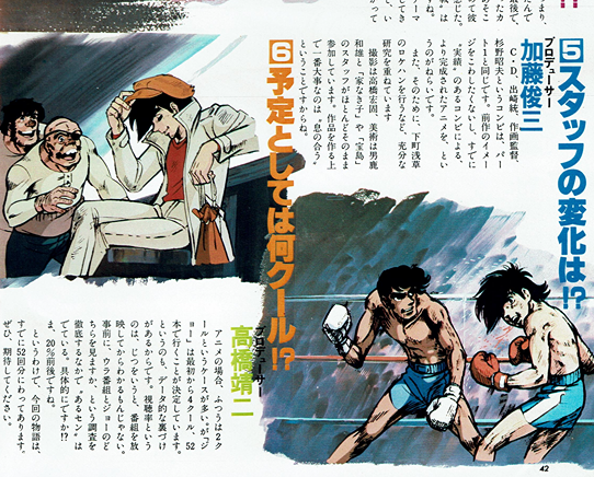 Dezaki.「どさまわりの部分は、は ぶきます。まともにゆくと、も のすごく暗い話になりすぎます からね。それと、パート1のと き、じつをいうと、カーロス戦 がどうなるのかという話は聞 きながら”やっていた。つまり、 原作を追いこしちゃってたんで すよね。それに、原作の最後で、 パンチドランカーになったカ ーロスがでてきたけど、あそこ までいって、ぼくははじめて彼 “ステキなやつ”だと感じた。 当然、今回の”カーロス戦”は ちがった描き方になりますね。 とにかく、この話は、テーマ が最後になってはっきりしてき ましたから、細かい部分で、い ろいろ微妙に描き方がちがって くると思います。