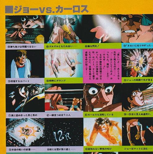 『あしたのジョー2」 前 半の最大の山場とも言え るのがジョー・カーロス 戦だ。テンプルが打てず 苦しんだジョーが、 力石 の亡霊を乗り越えて復活 したのは、決してジョー ひとりの力でも、単なる 時間の流れでもない。 そ こには、ジョーの復活を 心から願う葉子の、ジョ ーに賭ける決意があった。 そして、カーロスという、 野性と真の実力を持つボ クサーがいた・・・・・・ 今、監督出崎統氏のコ メントを交えながら、シ ョー・カーロス戦の徹底 分析を試みた。 ジョー・ カーロス戦の興奮を、も う一度この誌上で味わっ てほしい。